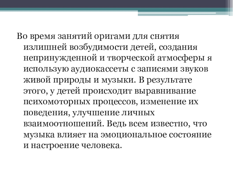 Слайд 5Во время занятий оригами для снятия излишней возбудимости детей, создания непринужденной
