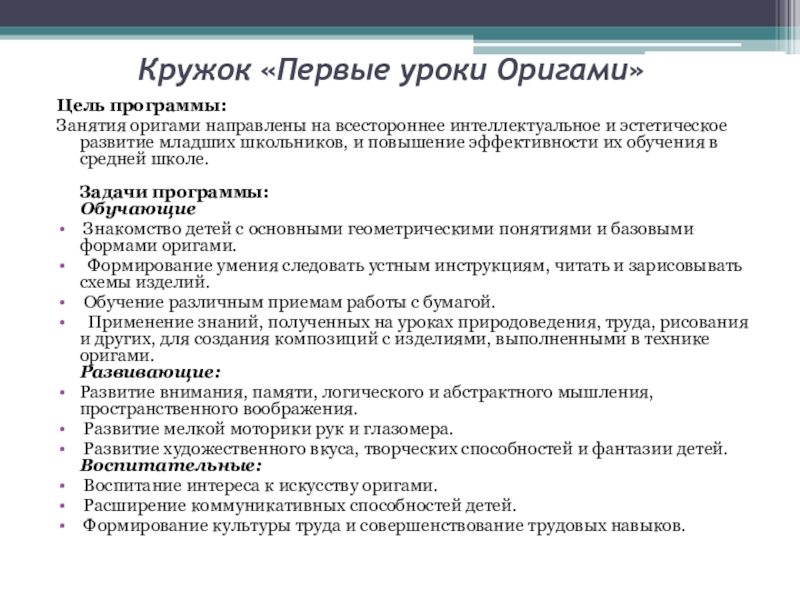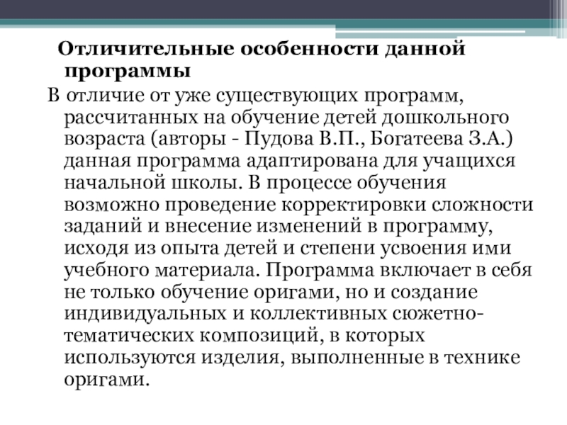 на обучение детей дошкольного возраста (авторы - Пудова В.П., Богатеева З.А.) данная программа адаптирована для учащихся начальной школы. В процессе обучения возможно проведение корректировки сложности заданий и внесение изменений в программу, исходя из опыта детей и степени усвоения ими учебного материала. Программа включает в себя не только обучение оригами, но и создание индивидуальных и коллективных сюжетно-тематических композиций, в которых используются изделия, выполненные в технике оригами.