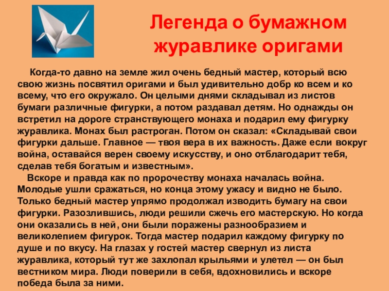 Вскоре и правда как по пророчеству монаха началась война. Молодые ушли сражаться, но конца этому ужасу и видно не было. Только бедный мастер упрямо продолжал изводить бумагу на свои фигурки. Разозлившись, люди решили сжечь его мастерскую. Но когда они оказались в ней, они были поражены разнообразием и великолепием фигурок. Тогда мастер подарил каждому фигурку по душе и по вкусу. На глазах у гостей мастер свернул из листа журавлика, который тут же захлопал крыльями и улетел — он был вестником мира. Люди поверили в себя, вдохновились и вскоре победа была за ними.