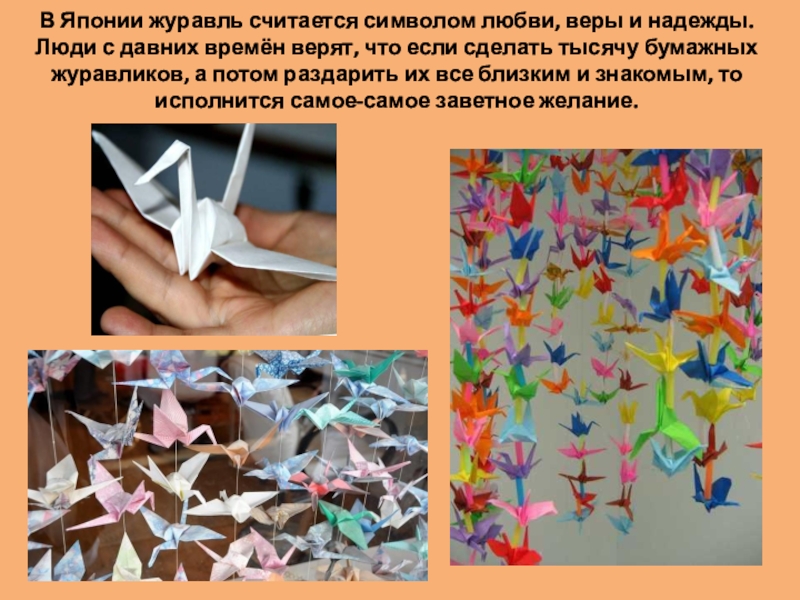 давних времён верят, что если сделать тысячу бумажных журавликов, а потом раздарить их все близким и знакомым, то исполнится самое-самое заветное желание.