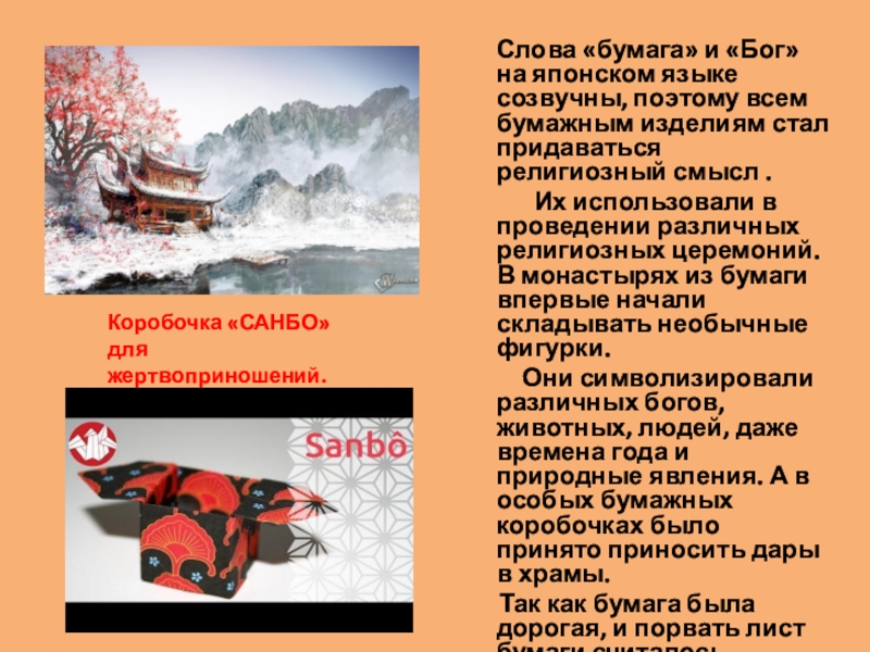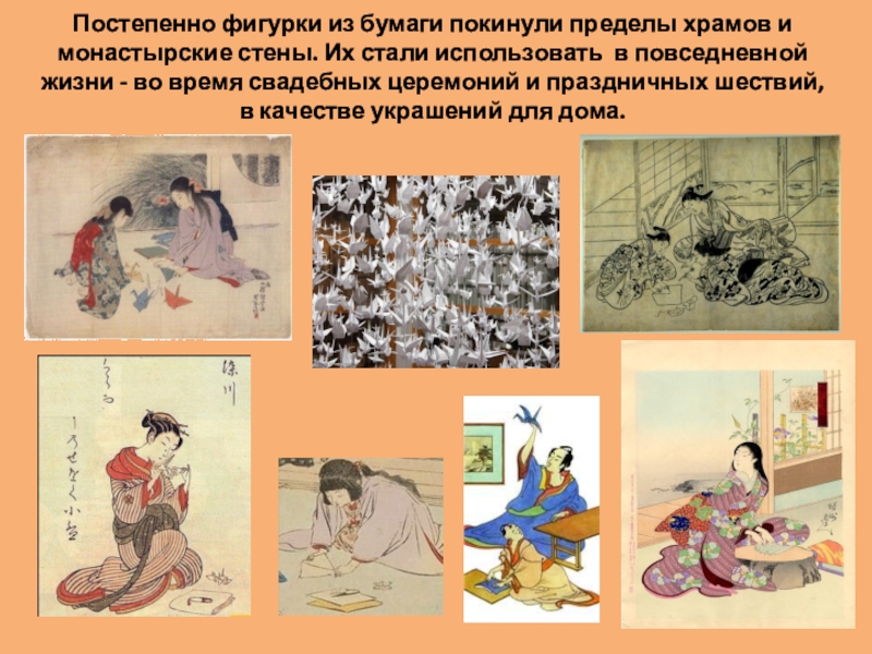 Их использовали в проведении различных религиозных церемоний. В монастырях из бумаги впервые начали складывать необычные фигурки.
