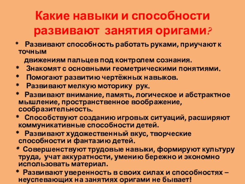 Слайд 30Какие навыки и способности развивают занятия оригами?