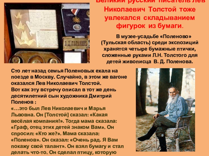 Слайд 19Великий русский писатель Лев Николаевич Толстой тоже увлекался складыванием фигурок из