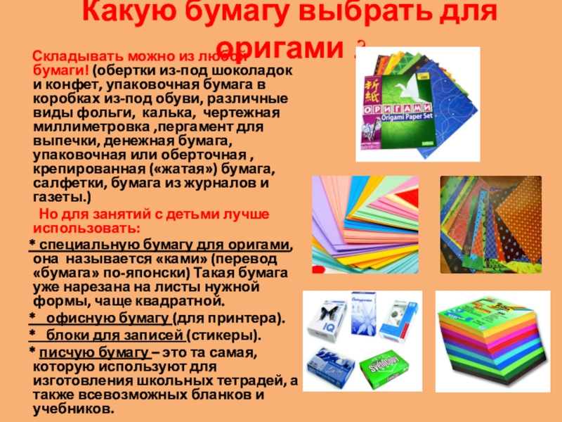 * специальную бумагу для оригами, она называется «ками» (перевод «бумага» по-японски) Такая бумага уже нарезана на листы нужной формы, чаще квадратной.
