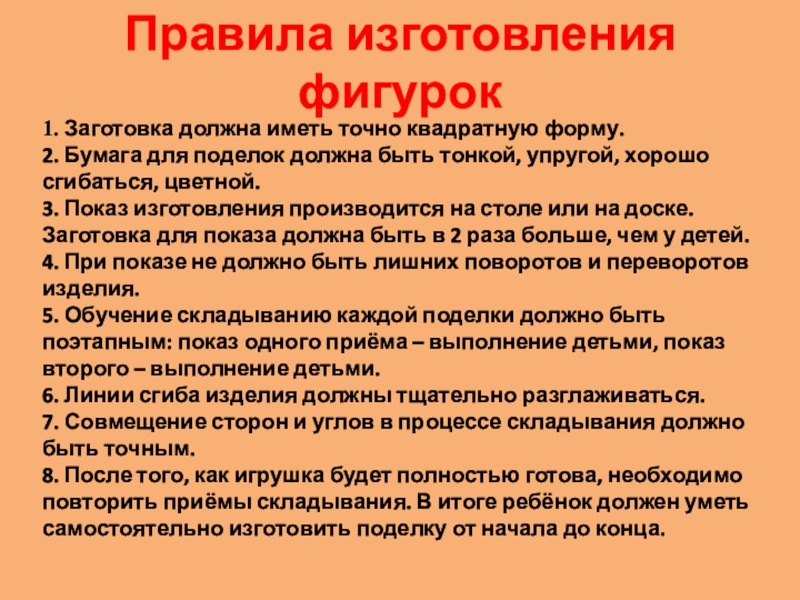 5. Обучение складыванию каждой поделки должно быть поэтапным: показ одного приёма – выполнение детьми, показ второго – выполнение детьми.