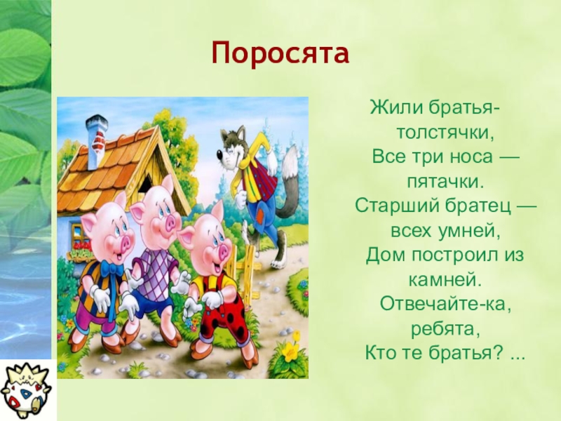 ПоросятаЖили братья-толстячки, Все три носа — пятачки. Старший братец — всех умней, Дом построил из камней. Отвечайте-ка,
