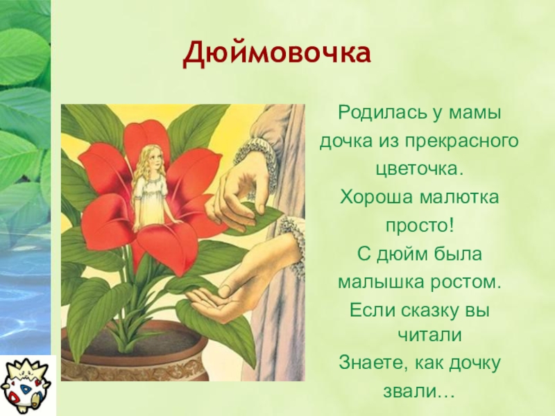 ДюймовочкаРодилась у мамыдочка из прекрасногоцветочка. Хороша малюткапросто!С дюйм быламалышка ростом.Если сказку вы читалиЗнаете, как дочку звали…