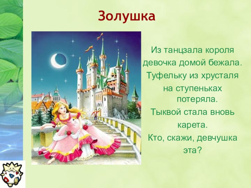 ЗолушкаИз танцзала королядевочка домой бежала.Туфельку из хрусталяна ступеньках потеряла.Тыквой стала вновькарета. Кто, скажи, девчушкаэта?