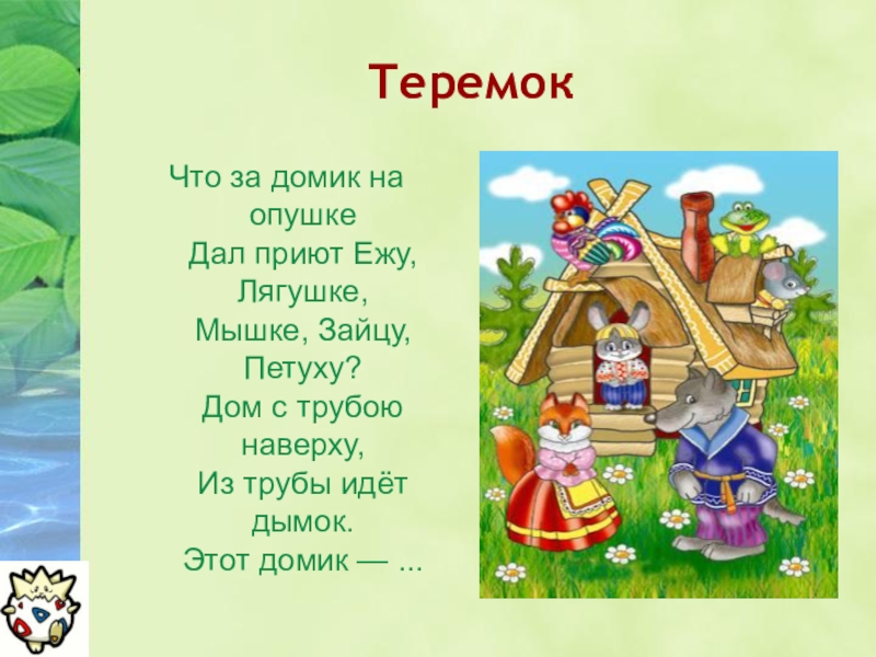 ТеремокЧто за домик на опушке Дал приют Ежу, Лягушке, Мышке, Зайцу, Петуху? Дом с трубою наверху, Из