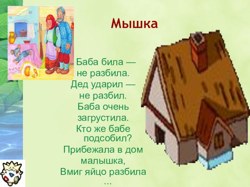 Мышка Баба била — не разбила.Дед ударил — не разбил.Баба очень загрустила.Кто же бабе подсобил?Прибежала в доммалышка,Вмиг