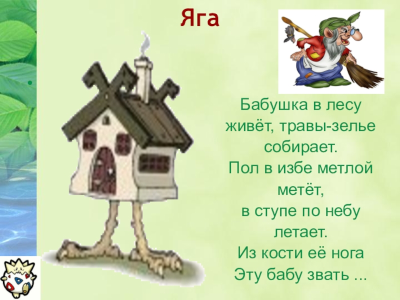 ЯгаБабушка в лесуживёт, травы-зельесобирает.Пол в избе метлойметёт,в ступе по небулетает.Из кости её ногаЭту бабу звать ...