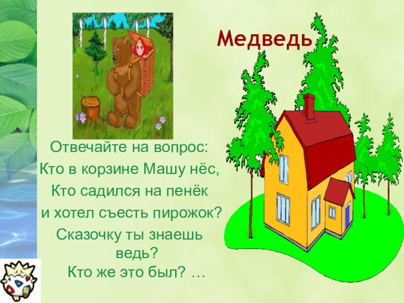 МедведьОтвечайте на вопрос:Кто в корзине Машу нёс,Кто садился