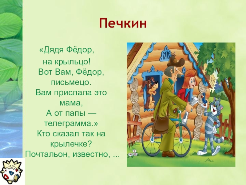 Печкин«Дядя Фёдор, на крыльцо! Вот Вам, Фёдор, письмецо. Вам прислала это мама, А от папы — телеграмма.»
