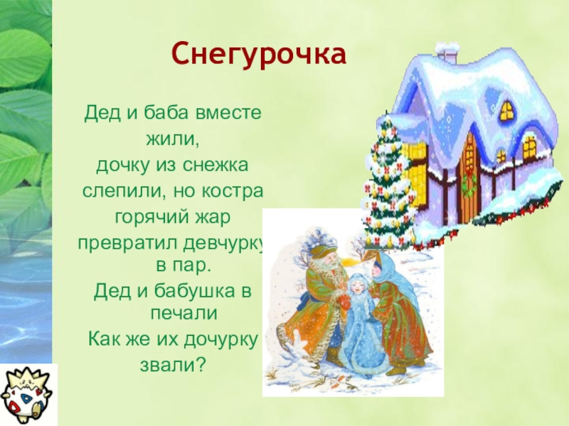 СнегурочкаДед и баба вместежили, дочку из снежкаслепили, но кострагорячий жар превратил девчурку в пар. Дед и бабушка