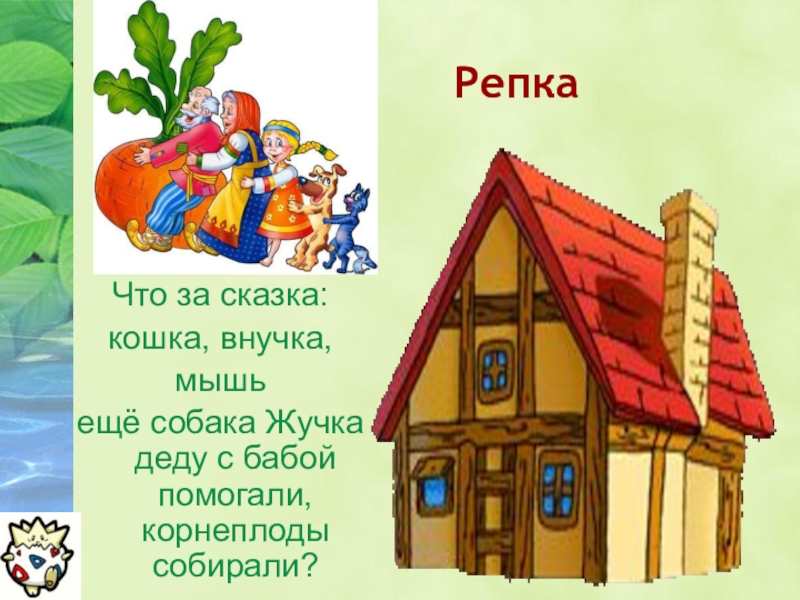 РепкаЧто за сказка:кошка, внучка,мышьещё собака Жучка деду с бабой помогали, корнеплоды собирали?