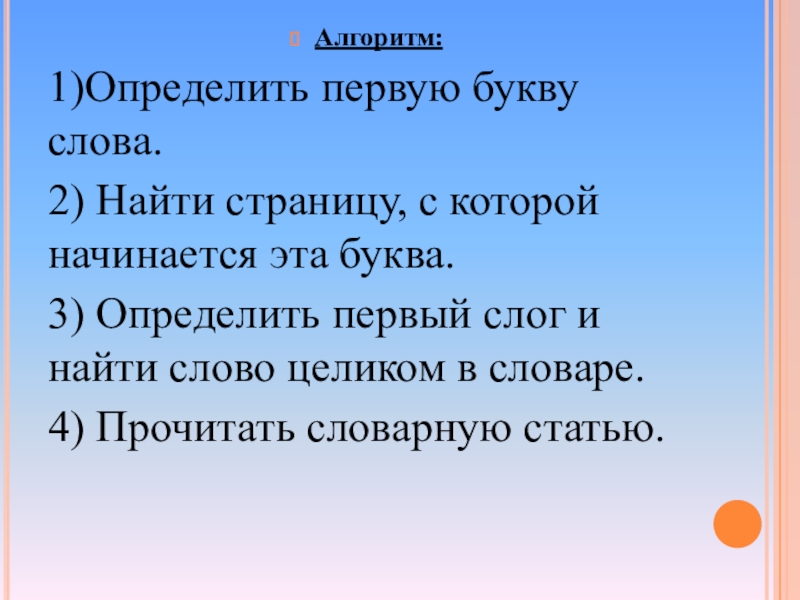 Алгоритм:1)Определить первую букву слова. 2) Найти страницу, с которой начинается эта буква.3) Определить первый слог и найти слово целиком в словаре.4) Прочитать словарную статью.
