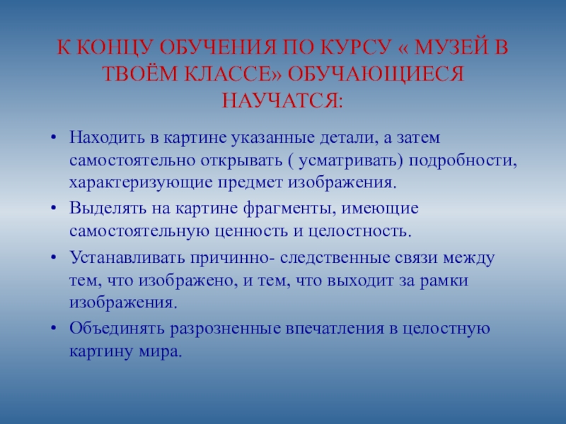 Находить в картине указанные детали, а затем самостоятельно открывать ( усматривать) подробности, характеризующие предмет изображения.