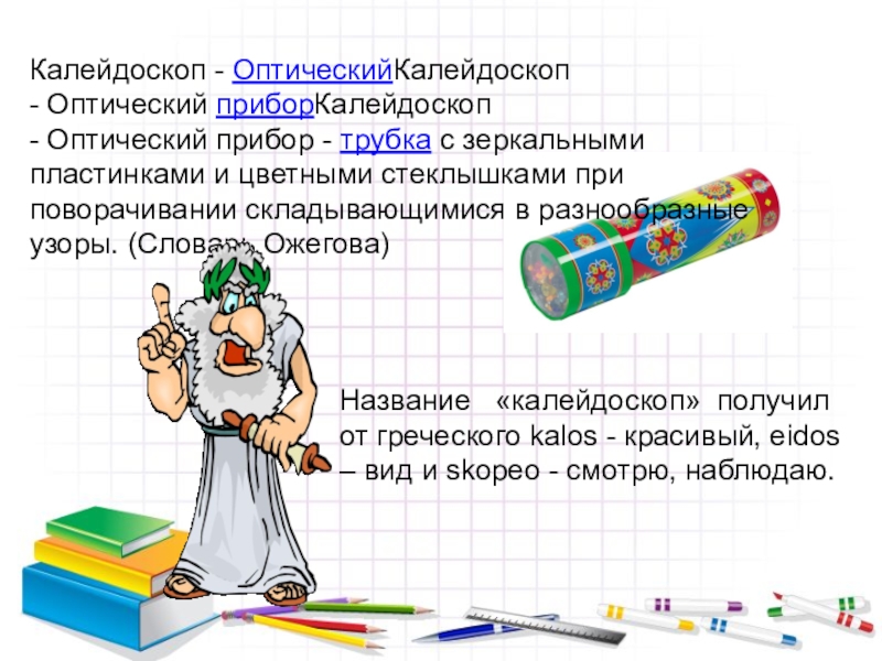 Название «калейдоскоп» получил от греческого kalos - красивый, eidos – вид и skopeo - смотрю, наблюдаю.