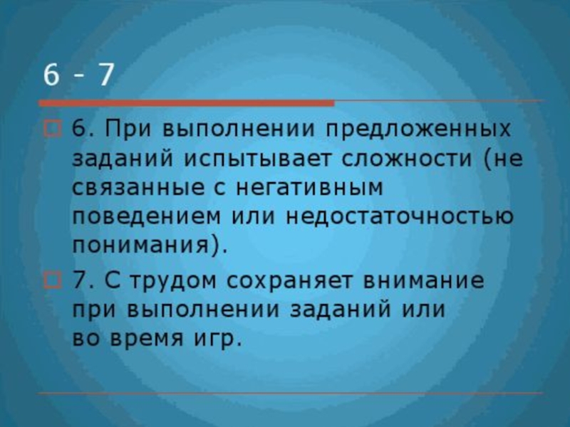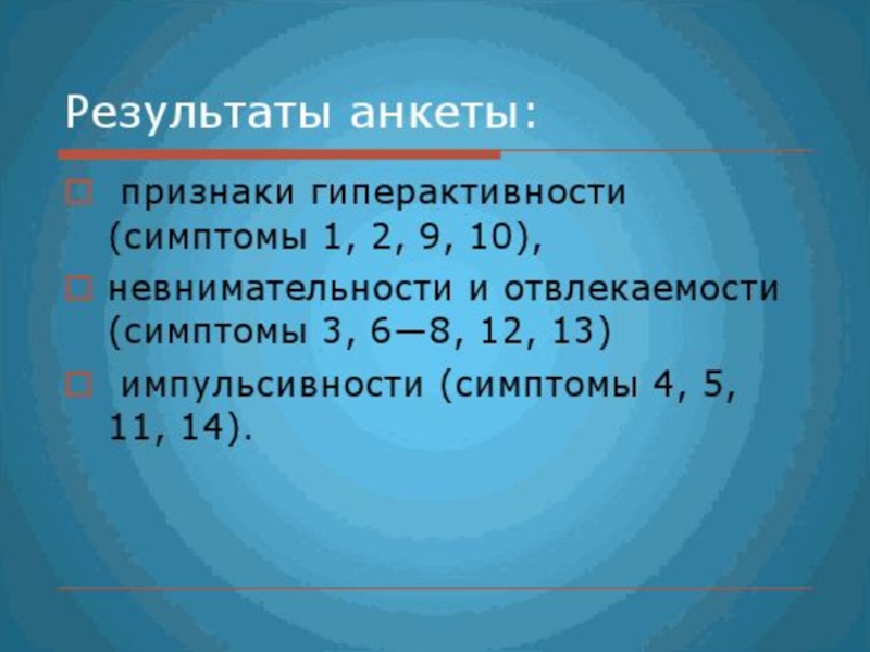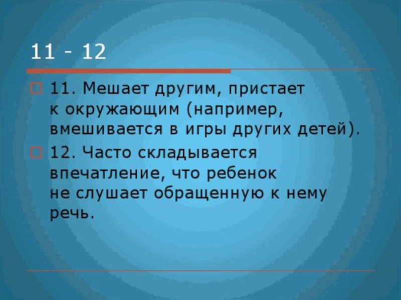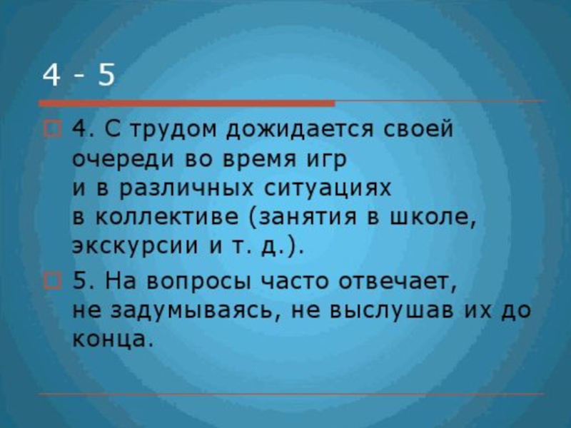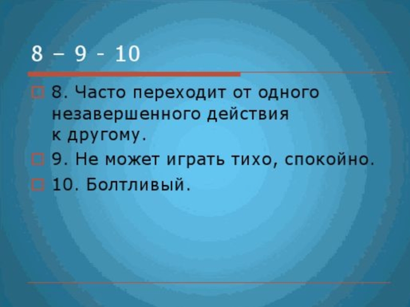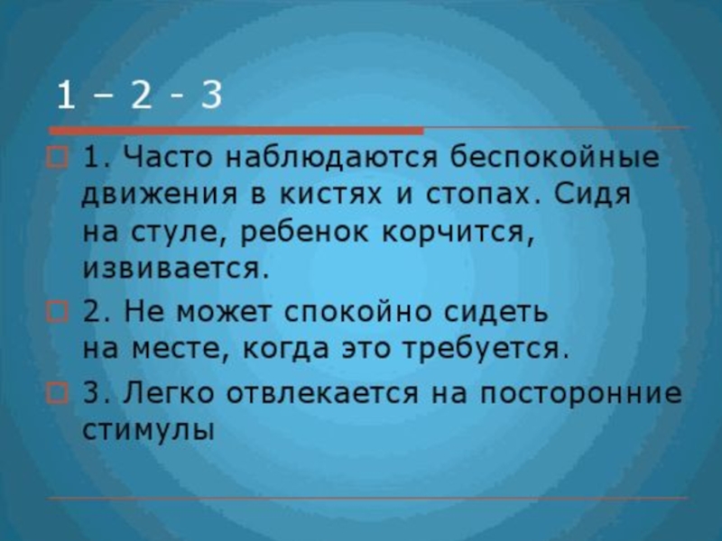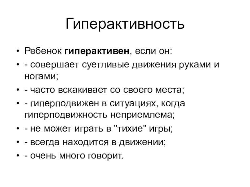 пищи, выполнение домашних заданий, сон), предоставлять ему возможность расходовать избыточную энергию в физических упражнениях, длительных прогулках, беге. Следует также избегать утомления при выполнении заданий, так как при этом может усиливаться гиперактивность. "Гиперактивные" дети чрезвычайно возбудимы, поэтому необходимо исключить или ограничить их участие в мероприятиях, связанных со скоплением большого числа людей. Так как ребенок испытывает сложности в концентрации внимания, нужно давать ему только одно задание на определенный промежуток времени. Важен выбор партнеров для игр - друзья ребенка должны быть уравновешенными и спокойными.
