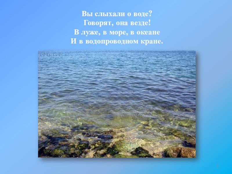 Вы слыхали о воде?Говорят, она везде!В луже, в море, в океанеИ в водопроводном кране.