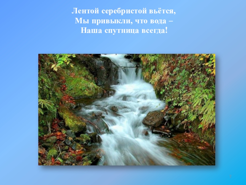 Слайд 7 Лентой серебристой вьётся, Мы привыкли, что вода – Наша спутница всегда!