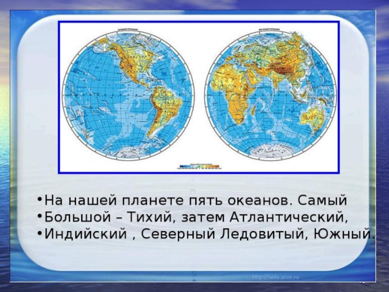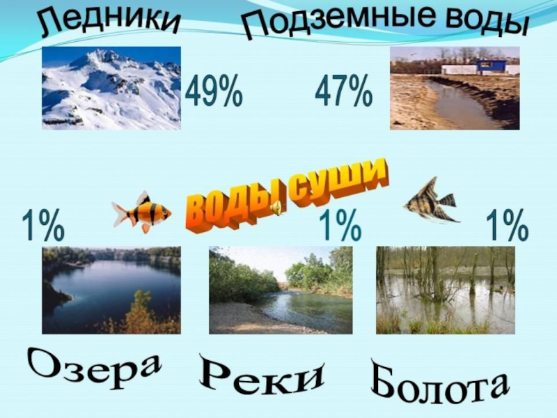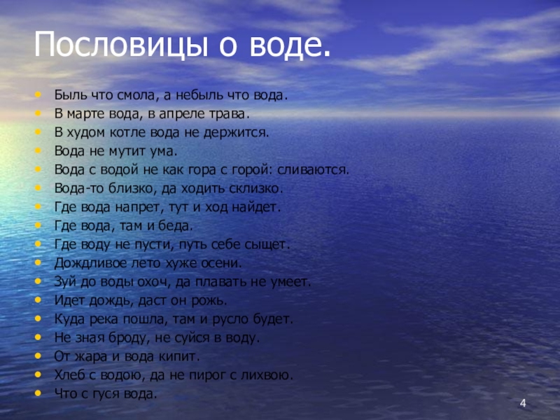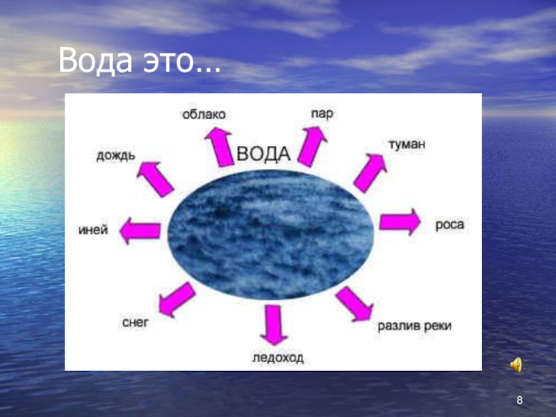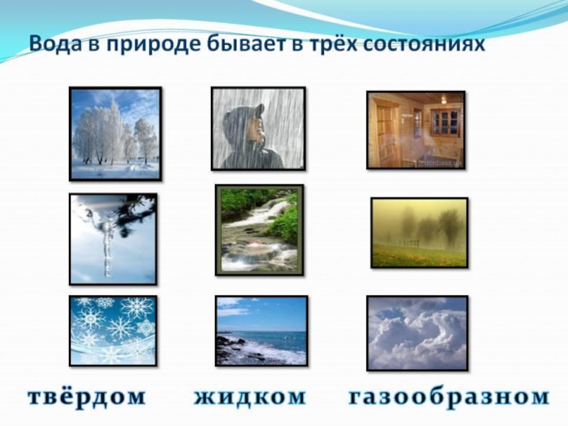 в океанах и морях, реках и озёрах, под землёй и над землёй, в почве. Много воды содержится в атмосфере: это облака, туман, пар, дождь, снег.