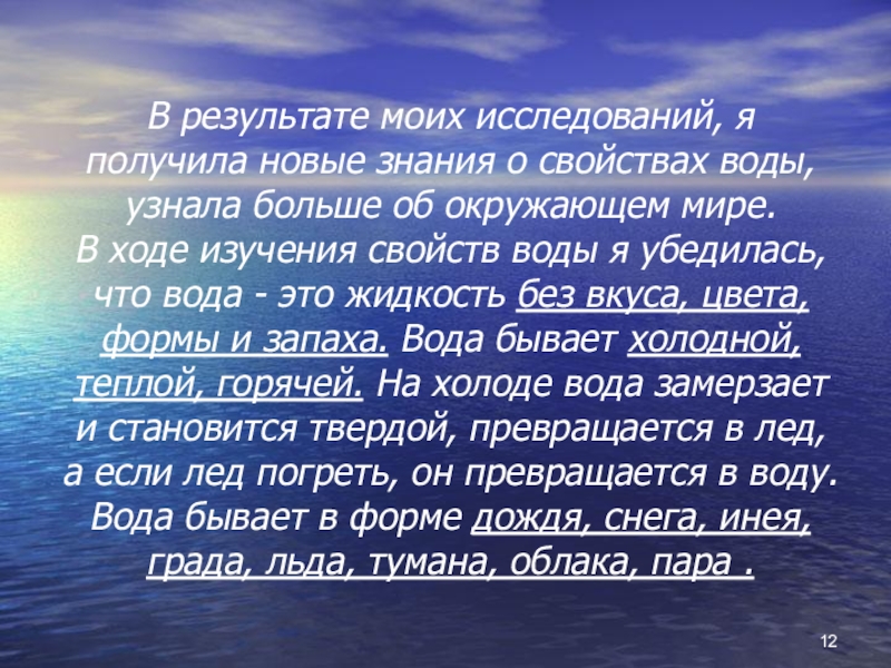 Слайд 12В результате моих исследований, я получила новые знания о свойствах воды,