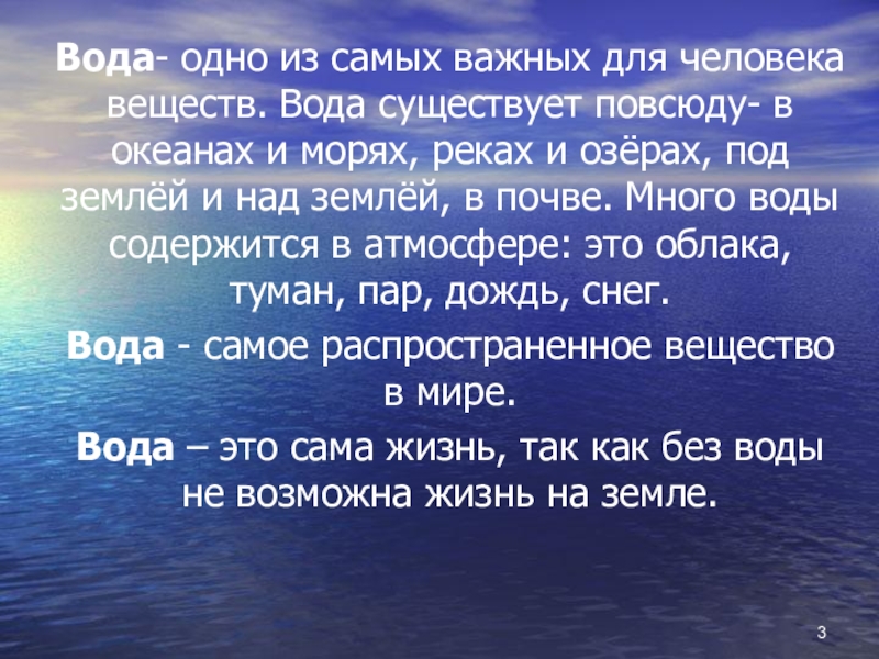 Слайд 3Вода- одно из самых важных для человека веществ. Вода существует повсюду-