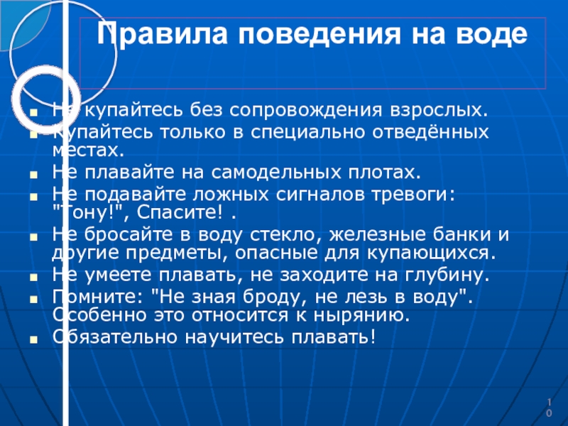 Правила поведения на воде Не купайтесь без сопровождения взрослых.Купайтесь только в специально отведённых местах.Не плавайте на самодельных