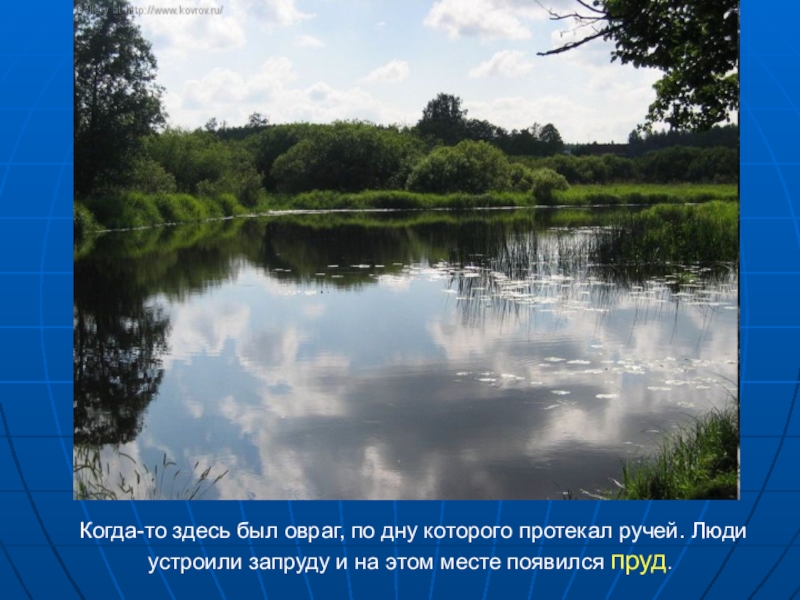 Когда-то здесь был овраг, по дну которого протекал ручей. Люди устроили запруду и на этом месте появился