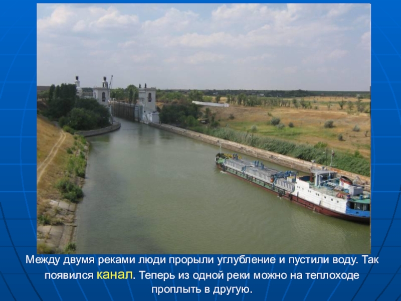 Слайд 9Между двумя реками люди прорыли углубление и пустили воду. Так появился