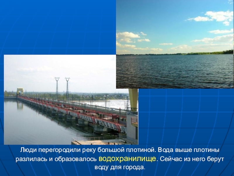 Люди перегородили реку большой плотиной. Вода выше плотины разлилась и образовалось водохранилище. Сейчас из него берут воду