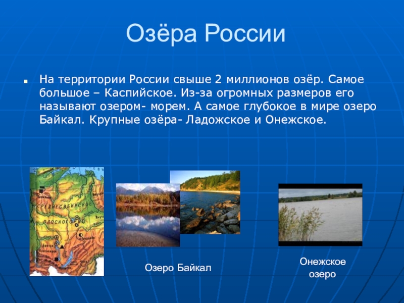Озёра РоссииНа территории России свыше 2 миллионов озёр. Самое большое – Каспийское. Из-за огромных размеров его называют