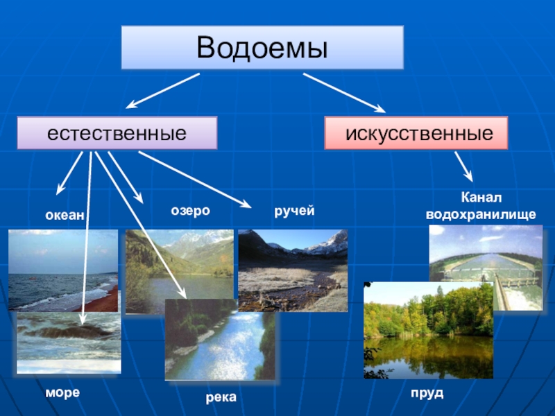 Водоемыестественные  искусственныеокеанмореозерорекаручейКаналводохранилищепруд