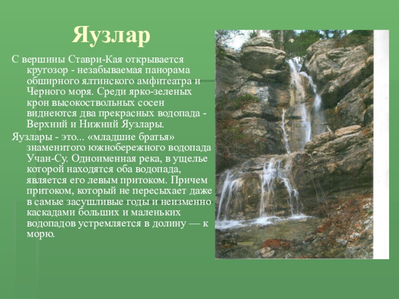 и Черного моря. Среди ярко-зеленых крон высокоствольных сосен виднеются два прекрасных водопада - Верхний и Нижний Яузлары.