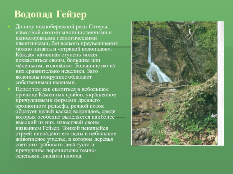 Перед тем как скатиться в небольшое урочище Каменных грибов, украшенное причудливыми формами древнего эрозионного рельефа, речной поток образует целый каскад водопадов, среди которых особенно выделяется наиболее высокий из них, известный своим названием Гейзер. Тонкой пенящейся струей ниспадают его воды в небольшое живописное ущелье, в котором деревья светлого грабового леса густо и причудливо переплетены темно-зелеными лианами плюща.