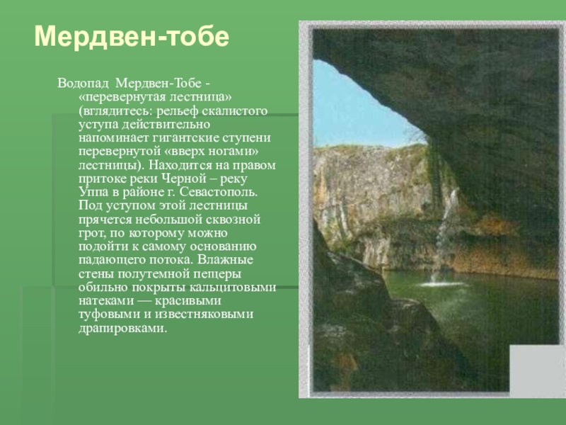 гигантские ступени перевернутой «вверх ногами» лестницы). Находится на правом притоке реки Черной – реку Уппа в районе г. Севастополь. Под уступом этой лестницы прячется небольшой сквозной грот, по которому можно подойти к самому основанию падающего потока. Влажные стены полутемной пещеры обильно покрыты кальцитовыми натеками — красивыми туфовыми и известняковыми драпировками.