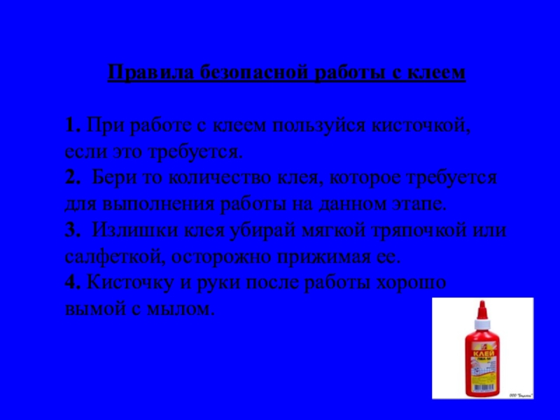 Правила безопасной работы с клеем 1. При работе с клеем пользуйся кисточкой, если это требуется.2. Бери то количество клея, которое требуется для выполнения работы на данном этапе.3. Излишки клея убирай мягкой тряпочкой или салфеткой, осторожно прижимая ее.4.