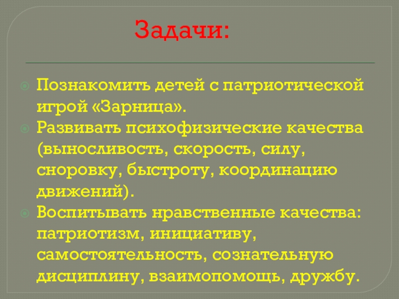 Задачи: Познакомить детей с патриотической игрой «Зарница».Развивать психофизические качества (выносливость, скорость, силу, сноровку, быстроту, координацию движений).Воспитывать нравственные