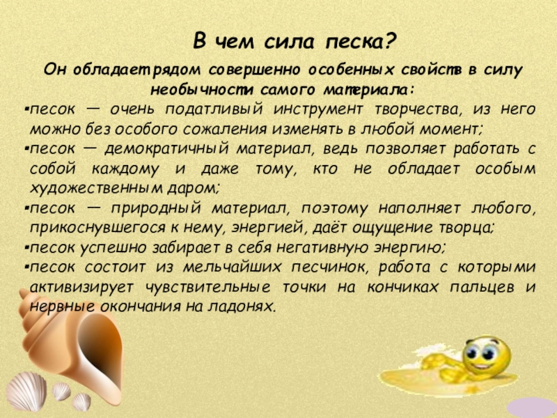 песок состоит из мельчайших песчинок, работа с которыми активизирует чувствительные точки на кончиках пальцев и нервные окончания на ладонях.