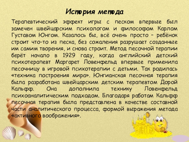 и философом Карлом Густавом Юнгом. Казалось бы, всё очень просто – ребёнок строит что-то из песка, без сожаления разрушает созданные им самим творения, и снова строит. Метод песочной терапии берёт начало в 1929 году, когда английский детский психотерапевт Маргарет Ловенфельд впервые применила песочницу в игровой психотерапии с детьми. Так родилась «техника построения мира». Юнгианская песочная терапия была разработана швейцарским детским терапевтом Дорой Кальфф. Она дополнила технику Ловенфельд психоаналитическим подходом. Благодаря работам Кальфф песочная терапия была представлена в качестве составной части аналитического процесса, формой выражения метода «активного воображения».