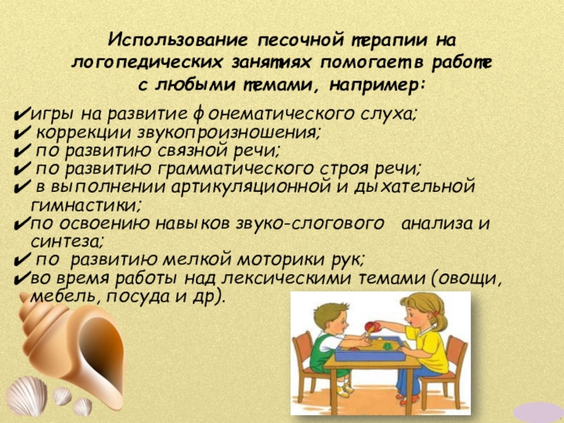 Использование песочной терапии на логопедических занятиях помогает в работе с любыми темами, например:игры на развитие фонематического слуха;
