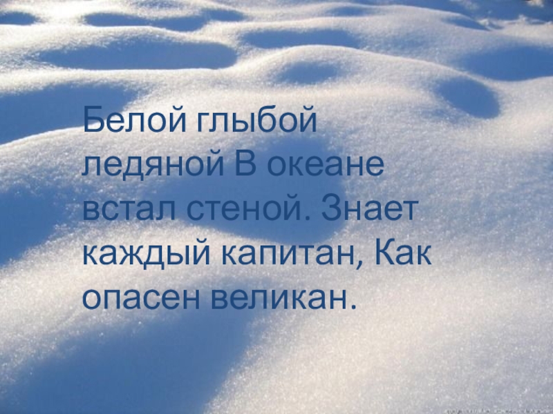 Слайд 21Белой глыбой ледяной В океане встал стеной. Знает каждый капитан, Как