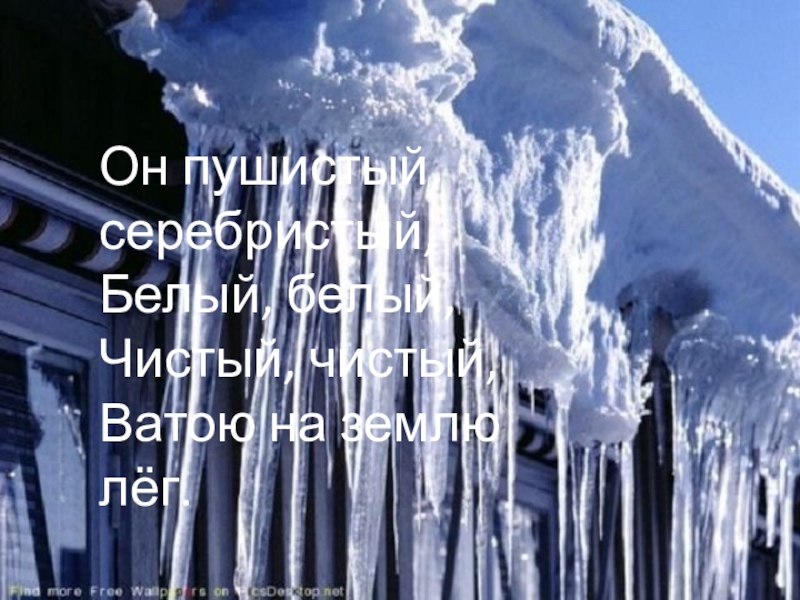 Слайд 20Он пушистый, серебристый, Белый, белый, Чистый, чистый, Ватою на землю лёг.