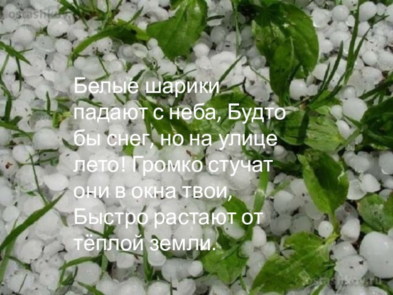 Белые шарики падают с неба, Будто бы снег, но на улице лето! Громко стучат они в окна