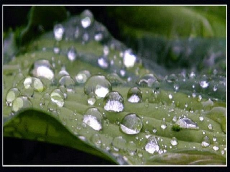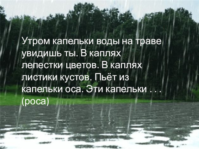 Утром капельки воды на траве увидишь ты. В каплях лепестки цветов. В каплях листики кустов. Пьёт из
