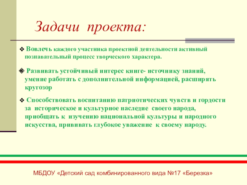 Способствовать воспитанию патриотических чувств и гордости за историческое и культурное наследие своего народа, приобщать к изучению национальной культуры и народного искусства, прививать глубокое уважение к своему народу.