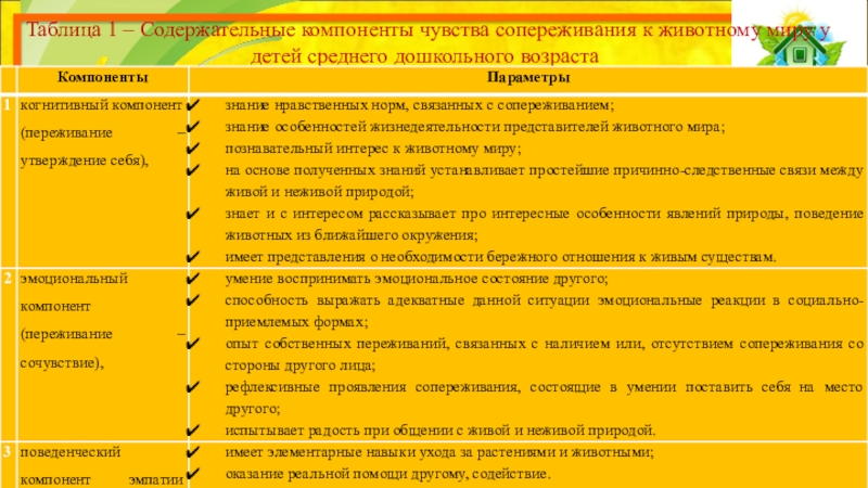 Слайд 14Таблица 1 – Содержательные компоненты чувства сопереживания к животному миру у