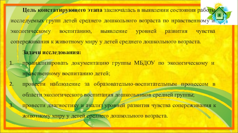 провести диагностику и анализ уровней развития чувства сопереживания к животному миру у детей среднего дошкольного возраста.