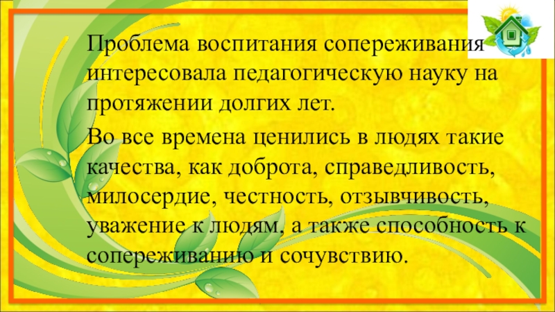 Слайд 2Проблема воспитания сопереживания интересовала педагогическую науку на протяжении долгих лет.